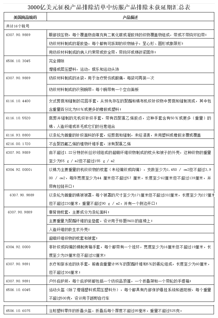 美国当地时间2020年当地时间8月28日,美国贸易代表办公室公布3000亿美元加征关税延长排除有效期产品清单。原美国3000亿关税排除产品清单共有214项,本次获得延长有效期的产品有87项(包含14个完全排除产品),约占原清单的40%,其中包括纺服产品35项;未获得延长有效期的产品有127项,约占