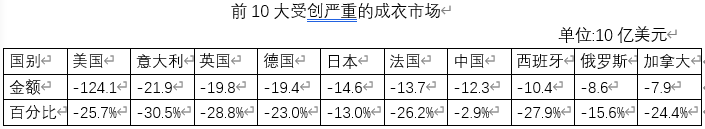 注意:该图表显示以美元计算10大受创严重全球成衣市场。金额和百分比下降表明,我们修正2020年预测与2019年市场规模之间差异。
