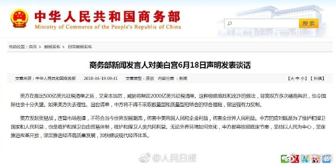 美方发起贸易战,违背市场规律,不符合当今世界发展潮流,伤害中美两国人民和企业利益,伤害全世界人民利益。中方的应对既是为了维护和捍卫国家和人民利益,也是维护和捍卫自由贸易体制,维护和捍卫人类共同利益。无论外界环境如何变化,中方都将按照既定节奏,坚持以人民为中心,坚定推进改革开放,坚定推进经济高质量发展,加快建设现代经济体系。(标题:商务部新闻发言人就美白宫6月18日声明发表谈话)