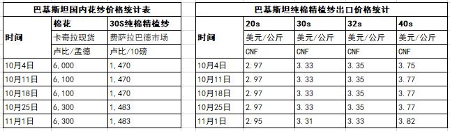10月25日至11月1日一周,受下游需求强劲、棉价稳定、棉花供应偏紧的影响,巴基斯坦纱线价格异常坚挺。