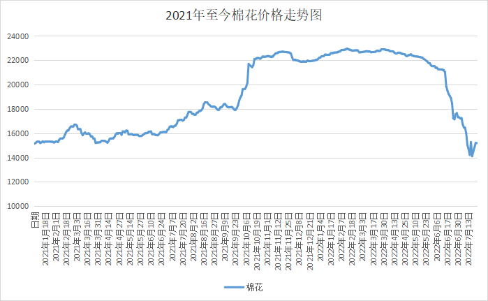 自6月美联储加息引发经济衰退担忧,棉花价格就开始快速下跌。具体来看,自6月15日-7月25日棉花期货价格从20365元/吨,下行至15195元/吨,跌幅25.39%,现货价格从20850元/吨下行至15800元/吨,跌幅24.22%。