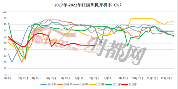 自打今年上海疫情之后市场上的订单就开始减少,而在江浙地区有那么多的纺织企业,订单数量却大幅减少,致使一些接不到订单的纺织老板直接陷入了绝境。开机开高了没人买,那还不如降低开工,根据绸都网的数据监测来看,本周江浙地区织造开机率再次下调了1%至65%左右。