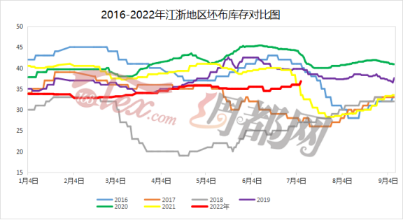 而正因为没有订单,现在的织造企业就只能生产库存,再加上上半年受到疫情影响,旺季不旺很多库存都没卖掉,进一步加剧了产能过剩的问题,即使上游原料端整天变化,下游价格波动的幅度却很小。进入7月,纺织企业的产销难以做平,库存有向上攀升的迹象,从中国绸都网监测的数据来看,江浙坯布库存大概在36.8天。