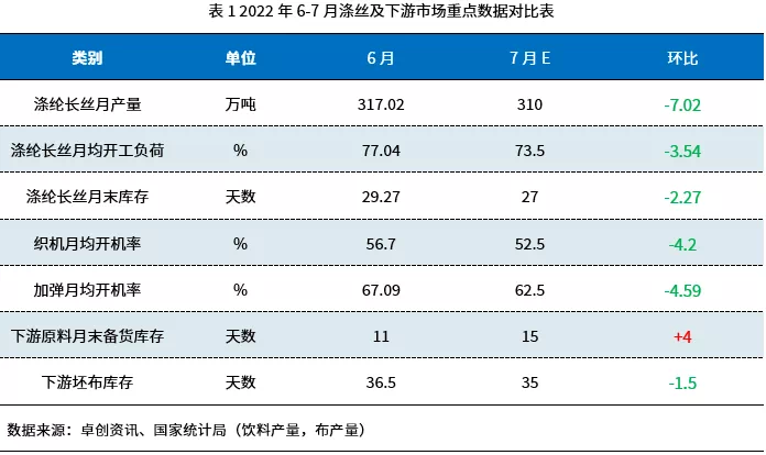 6月,涤纶长丝产量明显增长,但下游需求下降,导致涤纶长丝去库存效果不理想。6月涤纶长丝产量在317.02万吨,环比上升2.41%,同比上升1.39%。6月产量环比增长主要由于三大主流聚酯工厂月中起陆续提升涤纶长丝装置负荷2成,涉及产能约为424万吨。另外6月涤纶长丝检修装置也较多。6月初开始,长乐和宁波地区管道等设备检查导致山力、金纶、泉迪等工厂装置的陆续检修,涉及产能140万吨;6月中旬开始,恒力40万吨装置轮动检修,另外,盛虹20万吨和荣盛10万吨装置相继检修。6月,下游需求逐步进入淡季,行业开机率低位下降。供应增加,需求下降,导致6月涤纶长丝工厂库存仍处于高位。6月底,涤纶长丝工厂库存29.27天,较5月底下降1.53天,较6月初上涨1.33天。