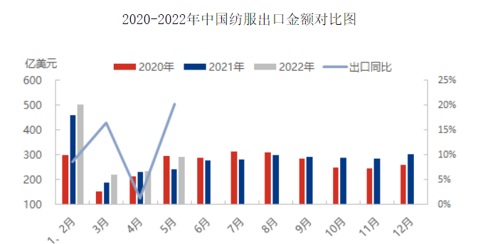 三是外贸基本面向好趋势明显。据海关统计,2022年5月中国纺织品服装出口292.3亿美元,同比增长20.4%,环比增长23.9%。1-5月,全国纺织品服装出口1250.7亿美元,同比增长11.2%。数据对比来看,我国纺织品出口金额同比均高于2021年同期。我国疫情率先得到良好控制,我国纺织品服装出口存一定优势。