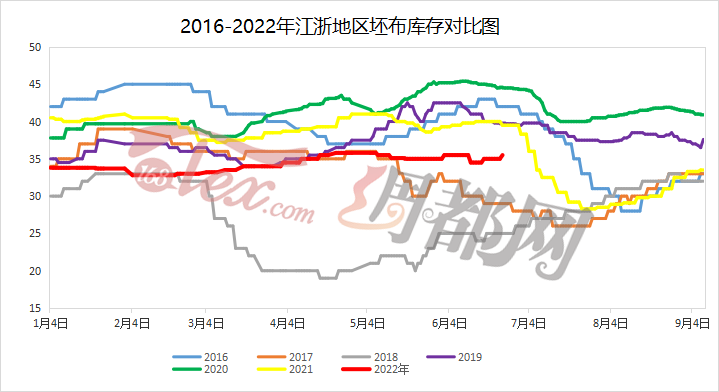 上半年国内纺织行业受疫情叠加高成本的影响,致使纺织品、服装订单外流,企业长期处于高库存状态。而此次的“618”电商节不如预期,服装销售战绩欠佳,并未带动下游大量走货,因此工厂去库存缓慢。据了解,由于前期转移至苏北、安徽、江西等地的织机规模普遍大于江浙地区,因此库存累积速度也更快,受到行情波动的影响也更大。