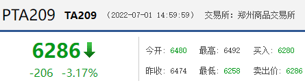 截至7月1日15时收盘,PTA期货收盘报价6286点,较前一交易日下跌206点,跌幅为3.17%。