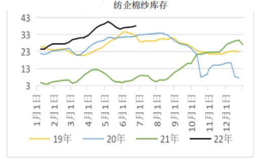 而目前正值下游传统淡季,企业接单气氛低迷,对于原材料购买的积极性逐渐衰退。截至6月20日,纺织企业棉纱库存维持在38天左右,棉纱市场走货偏弱,纺企棉纱库存下降后又有上升势头。