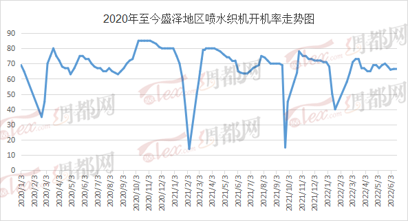 下游已有部分小型纺织企业为规避风险,出现停工现象,计划到新棉上市前后再开工生产。包括本地的喷水、喷气织机的负荷也在逐步下降。据绸都网数据监测,目前盛泽地区的喷水、喷气织机开机率在66.5%,环比下降4.5%,同比下降2.5%。