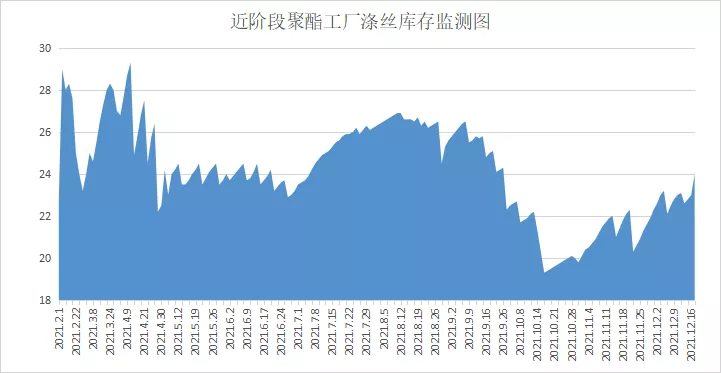 其实这也是可以理解的,11月的织造厂商由于在10月原料疯涨时,在买涨情绪下大量囤货,织造厂商手中原料库存均处于高位,因此11月的产销低迷可以说是被10月份透支了,因此10月份的聚酯工厂成功去库,但很快这种假象破灭,库存垒高问题再次显现,目前来看聚酯库存已经重新回到高位,根据绸都网的数据监测:现如今聚酯市场整体库存集中在19-29天;具体产品方面,其中POY库存至19-22天,FDY库存至19-20天附近,而DTY库存则至20-28天左右。
