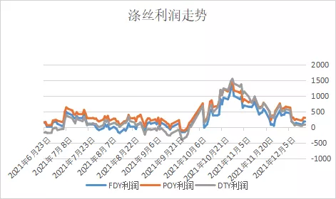 跌价直接带来的影响应该就是涤丝的利润受到影响,从十月破千的利润回落至现在出现两位数,截止12月17日常规规格的涤丝利润分别在:150D FDY利润为178元/吨、150D POY利润为308元/吨、150D FDY利润为78元/吨。