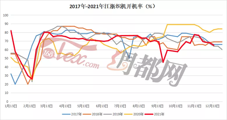 不仅仅是聚酯工厂的产销低迷,下游织造市场行情也同样不尽如人意,在上游不停降低负荷的同时,织造开机率也是在向下调整,尤其进入12月后处于一年的收尾之际,终端服装行业下单偏少,根据市场调研看,目前订单数量已经不如11月的下单量,而纺织企业在临近春节假期也会考虑交期酌情接单以中小单为主。