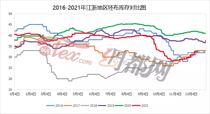 现在江浙地区织造开机率在72%左右,从十一月恢复产能开始便呈现稳中有降的趋势,毕竟库存增加的不仅仅是聚酯厂家,下游的织造坯布库存也在不断上升,目前根据绸都网监测的数据来看江浙地区织造坯布库存在32.5天左右,库存上升,行情不佳,下游的库存在年前恐将持续垒高。