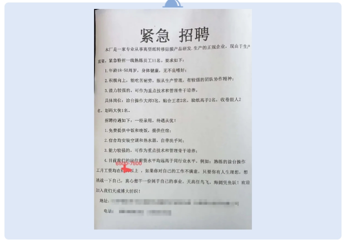 不仅如此,一家专门从事离型纸贴膜产品生产的厂家也发出了紧急招聘的通知!