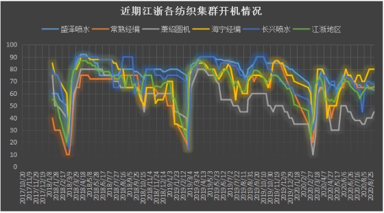 据中国绸都网监测数据显示,近期江浙地区开工率恢复至7成左右,其中喷水织机开机率在7成左右,经编织机开工率恢复至8-9成,圆机开机率在5成左右,与8月初环比上升了,上升了5个百分点左右。