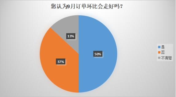 近期,小编在中国绸都网也做了一项对9月订单的调研,近200人参与了此次投票,结果5成投票人士认为9月订单环比走好,对后市行情持谨慎乐观的态度。