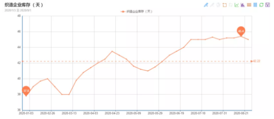 从原料端来看,涤丝厂家的优惠促销十分频繁,8月31日,涤丝平均产销破百,但也仅仅是“一日游”,到了9月1日,产销迅速降温,平均在5-7成。即便如今的原料价格处于低位,也无法激起织造厂家的购买,归根结底,还是由于纺织行业严重过剩的产能,库存居高不下,从中国绸都网监测的数据来看,目前江浙地区织造工厂的库存依旧处于40多天的高位。