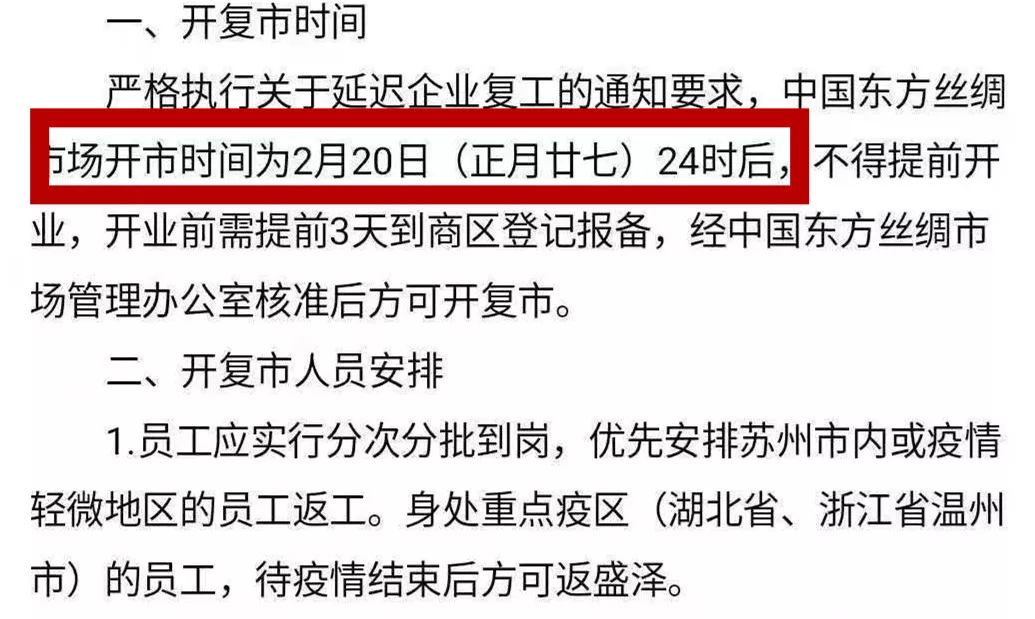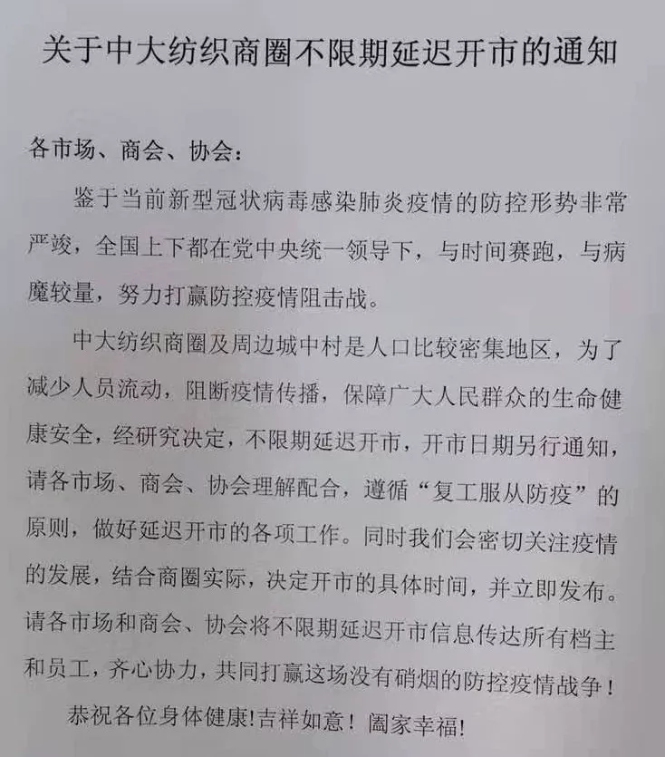 盛泽地区纺织工业开市时间从前不久宣布的2月10日推迟到了10天后的2月20日,但这个时间还是基于目前疫情的发展情况,一旦后期疫情有变,开工时间再次变化也不无可能。而广东的中大纺织市场在取消了原定于2月6日的开工日之后,直接“不限期”推迟开市。