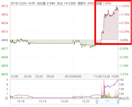 12月24日,郑商所PTA期货尾盘“翘首”,主力2005合约以4966元/吨收盘,与上一交易日结算价相比,上涨了70元/吨,涨幅为1.43%。