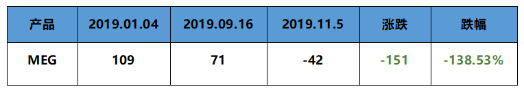乙二醇在上半年一直处于跌势,进入9月份,得益于低库存,乙二醇行情稍许有所好转,利润开始扭亏为盈。尤其是沙特石油遇袭事件对乙二醇影响较大,利润上升至71美元/吨,达到近半年来的赢利点。但随后,涤纶长丝需求萎靡,“金九银十”动力不足,乙二醇行情开始走弱,截至11月5日,乙二醇利润亏损至42美元/吨,与年初109美元/吨相比,跌幅甚至超130%!