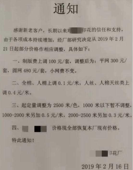上游染料市场上涨如此迅猛,可当时下游的印染厂却表现的异常平静,并没有利用这次千载难逢的机会上调染费。盛泽地区某家印花厂近的一次涨价通知单还是年初的2月16日发出的,目前8个多月已经过去了没有任何变化。