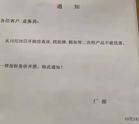 近期浙江地区某一染厂传出涨价的消息,随后盛泽地区一家日生产能力超过60万米的染厂也宣布28日开始仿真丝、四面弹、棉布等两次性产品取消优惠。要知道这家染厂在前不久还在对外宣称只要拿货来做价格都可以谈。