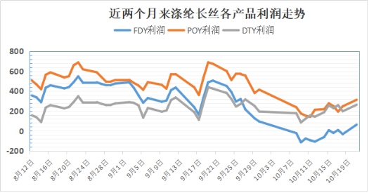根据中国绸都网数据监测显示,9月中旬以后,涤纶长丝各类产品的利润一直处于震荡下跌之中,涤纶FDY甚至一度陷入了亏损的困局。