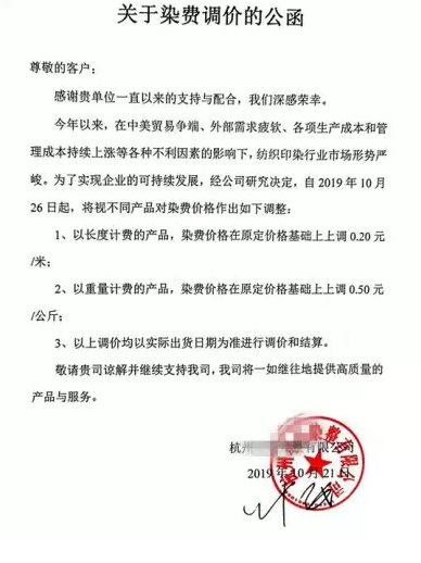 今年以来,在中美贸易争端、外部需求疲软、各项生产成本和管理成本持续上涨等各种不利因素的影响下,纺织印染行业市场形势严峻,从这张涨价通知单中也可见一斑,上涨染费也实属无奈!