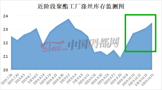 由于这段时间以来,聚酯主流产销不甚如意;而供应端来看,涤纶长丝在供应方面变化比较小,聚酯平均负荷围绕在90%偏上水平。从而导致了聚酯厂家库存的增压!从中国绸都网统计数据来看,现如今聚酯市场整体库存略增至16-25天;具体产品方面,其中POY库存至8-12天,FDY库存至14-19天附近,而DTY库存则至22-27天左右。