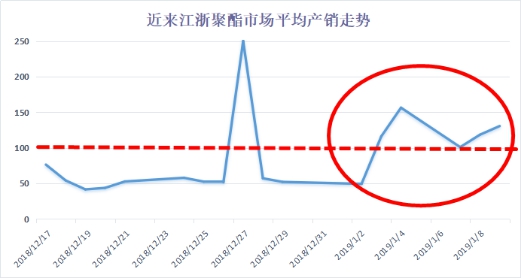 从十二月中下旬以来,涤丝主流产销低迷了将近十多天的时间,除却在12月27日当天由原油暴涨引发的产销强势回升至250%以外,其余产销多围绕在4-6成附近徘徊。而元旦后,在国际油价七连涨以及下游采购积极性提振下,打破了前期低产销以及“一日游”的困局,近日来涤丝市场主流产销节节攀升,超百成为常态,可以说是2018年下半年以来长的产销超百持续热度。