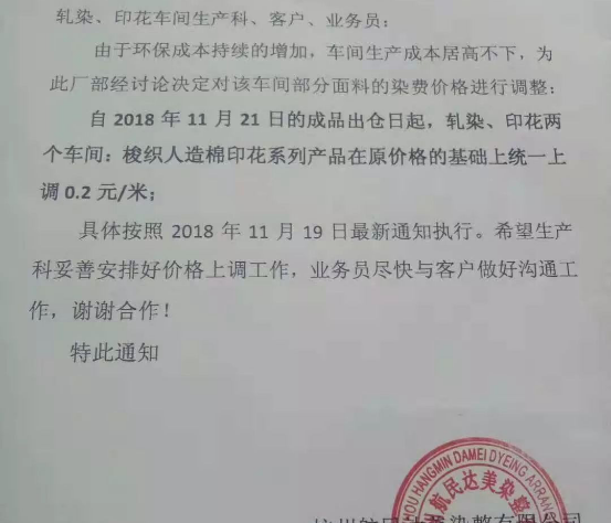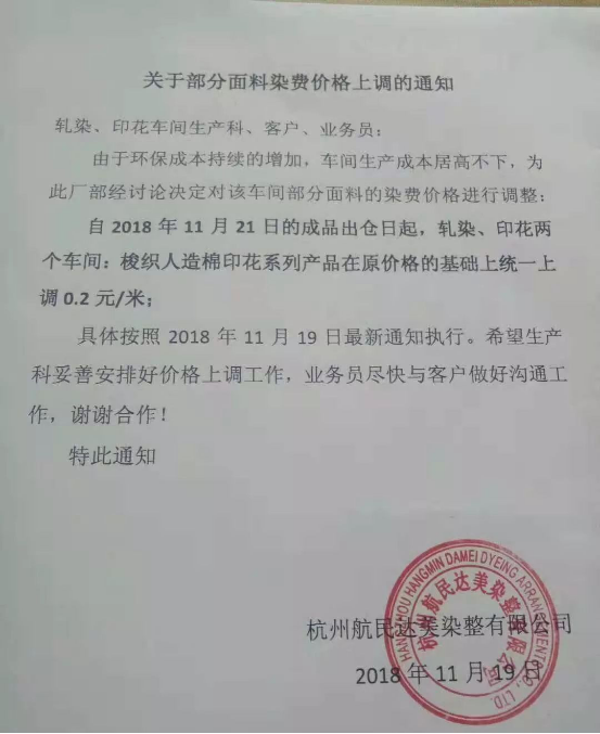 环保一直围绕在印染企业身边,对整个纺织业也有着不可忽视的影响。企业环保整顿,确实需要耗费不少财力,大多数新设备都要在百万元以上。另外,自2018年1月1日环保税法正式实施后,一家中型纺织印染生产企业的年度环保税额预估在30-70万元。印染企业的成本也在不断增加,故而在11月19日,印染业大佬航民染整发出染费上涨通知单。通知中表示,由于环保成本持续的增加,车间生产成本居高不下而导致染费上涨。