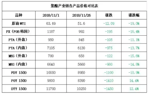 进入11月,聚酯产业链自由落体的跌价模式并没有终止,中旬以来在一波又一波的空头暴击下,聚酯产业链集体崩塌,无论是PX,PTA,乙二醇,聚酯切片、涤纶长丝,都处于一路向下的过程。在这次聚酯产业链普跌行情中,一向特立独行的乙二醇也难逃跌势。截至11月26日,乙二醇内盘价格已回落至6000元/吨以下,收于5660元/吨。