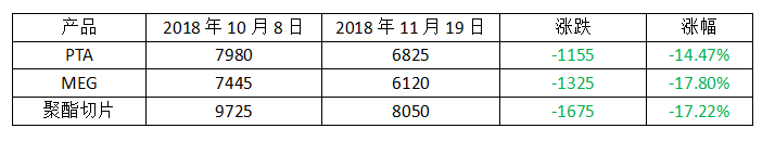 回头看10月份以来,宏观消息面利多寥寥,原油又暂无起色,聚酯大盘弱势为主,缺乏上行动力,聚酯切片跟随大流也在情理之中。聚酯切片可谓得到了重重一击,其价格重心直线走低,跌至7950元/吨附近,与10月初价格相比,其大幅下跌了将近1675元/吨,跌幅达到了17.22%。