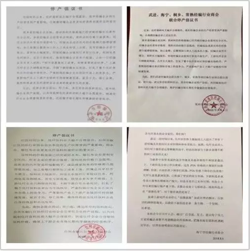 8月6日,武进、海宁、桐乡、常熟经编行业商会发布联合停产倡议书。