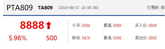 截至8月27日,PTA收盘报价8888点,较前一交易日上涨500点,涨幅为5.96,接近涨停。