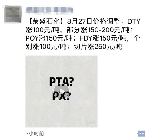 在PTA的带动下,8月27日,涤纶长丝再度全线普涨。