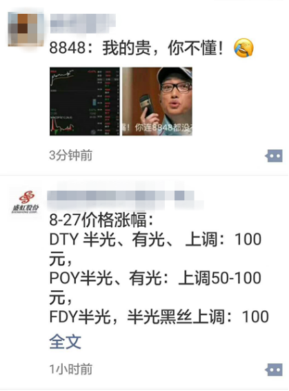 与此同时,在PTA上涨的时候,涤丝上涨从来就没有手软过,当天跟涨,产业链价格光速传导。