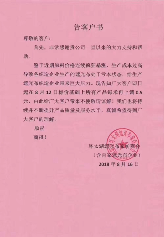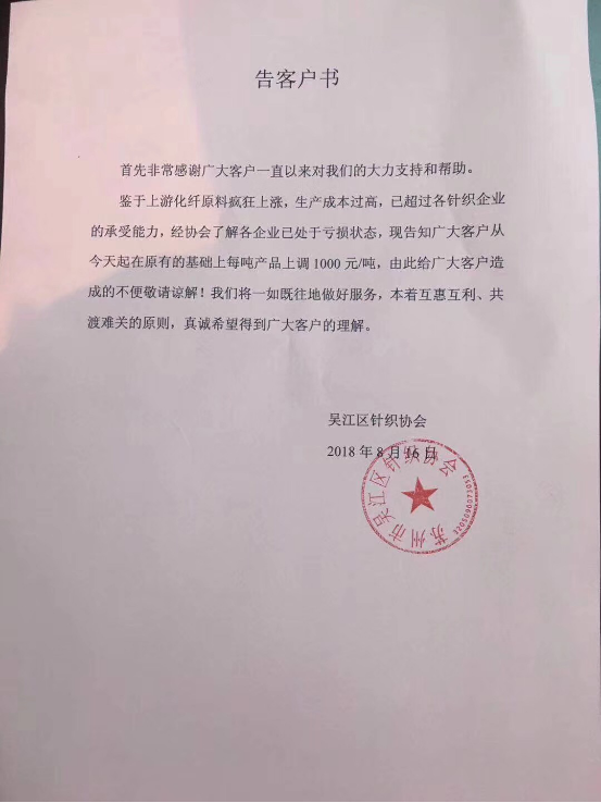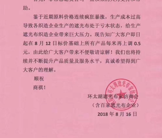 因为近一月来原材料涤丝价格暴涨,已有不少织造企业开始抱团涨价。