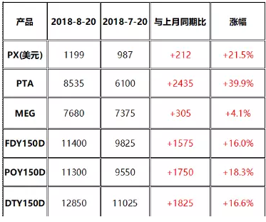 PTA涨,带动涤丝也涨,一天一个价,每天100、200地涨,半个月内涨了大概有1500—2000元/吨。