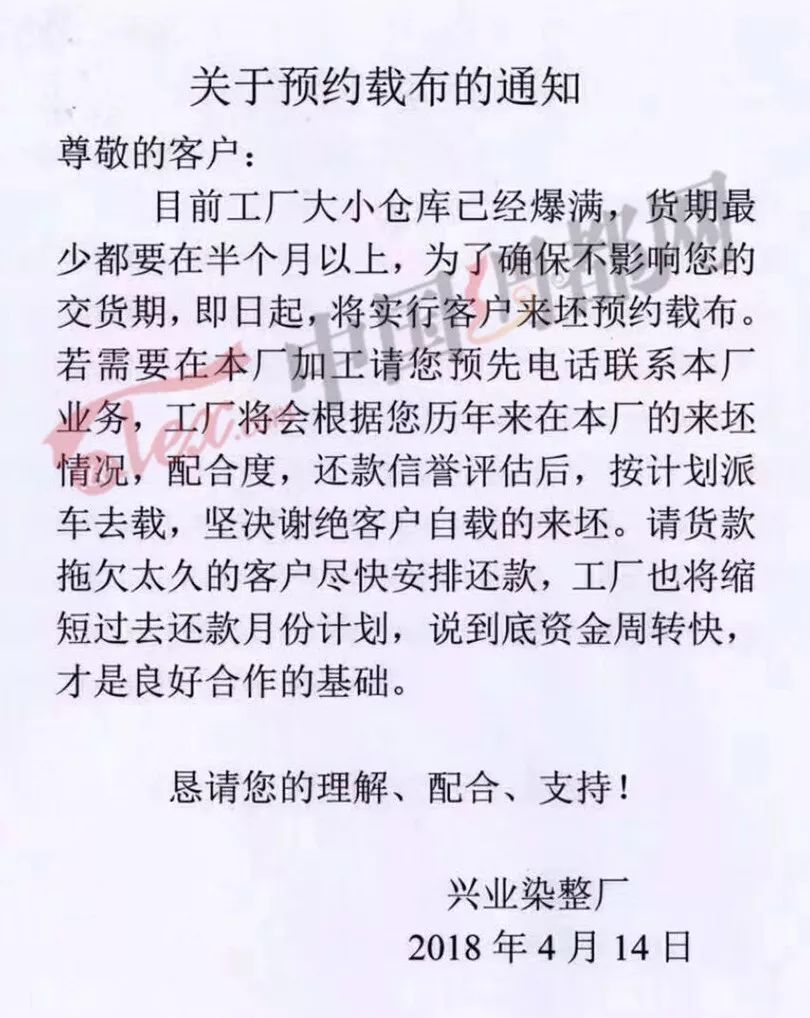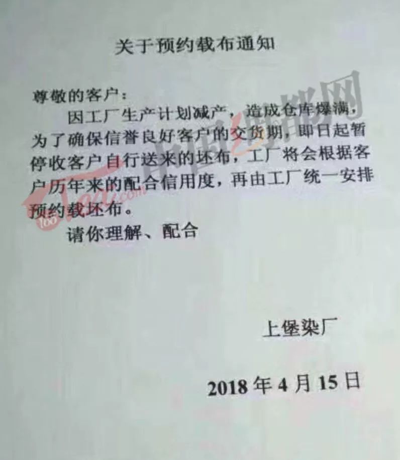 根据通知,由于染厂爆仓,客户自行载来的坯布一律拒收,染厂方面将根据客户登记信息、信誉程度等安排载布计划。