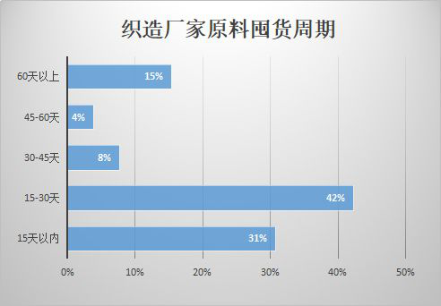从中国绸都网近期的调查结果可以窥见,其实大家目前的操作心态分化明显。虽然有70%以上的织造厂家囤货周期维持在15-30天的保守范围,但另外有15%的织造厂家却选择囤2个月以上的货!“有钱任性”可能是一方面的原因,更重要的应该还是对后市行情的看好,与其到时候等米下锅,不如先下手为强!