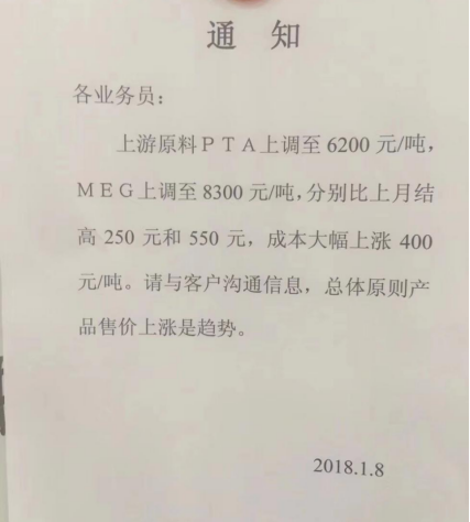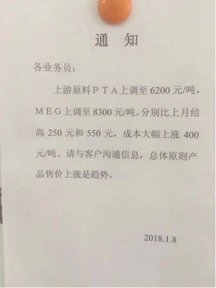 而早在PTA未上涨之前,涤纶长丝厂家就表示:不要怨我天天涨价,成本高企,其实我真的没那么赚钱!然而如今PTA的持续上涨势必又会给涤丝工厂的成本加了一码,亦为成为工厂涨价的又一个关注焦点。