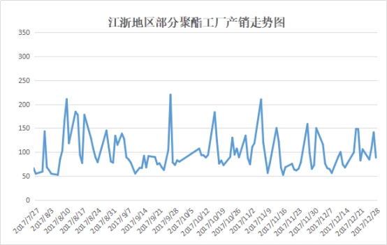 不过从上表可以看出,此轮涨价潮并未引起下游的共振,虽然原料涨幅明显,但是下游反应较为一般。首先来看价格,聚酯原料PTA和乙二醇价格上涨明显,但是涤丝价格跟进有限,聚酯厂家调价也是部分规格上涨,市场未见持续性的普涨行情。再来看产销,一直以来产销是体现市场活跃度的一个非常重要的因素。虽然月底涤丝价格蠢蠢欲动,但是下游备货态度还是相对谨慎的,仅27日个别厂家产销突破300%,整体产销在150%上下,其他时间下游备货热情不足。