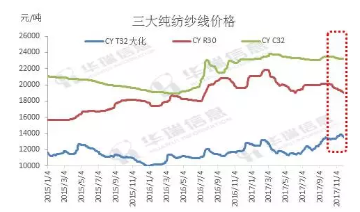 从10月下旬至今粘短价格不断下跌;棉花价格偏弱;而涤短价格不断上涨, 5月中旬至11月21日涤短累计上涨1700元/吨,涨幅22.8%,而11月下旬涤短价格也开始弱势下滑。在原料带动下近期三大纯纺纱线价格也弱势下滑,下图为三者价格走势,与原料同步。