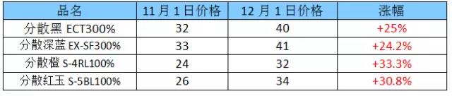 导读:近日染料市场出现背离价格曲线的上调通知,从12月1日起分散黑ECT300%将上涨至40元/KG,比目前的报价上涨8000元/吨。据悉,活性染料也将同步上涨,上涨幅度为10%。