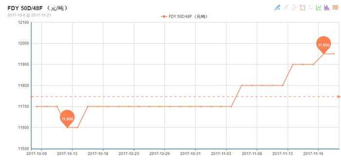 进入11月份之后,涤塔夫真的遭遇了寒潮。据了解,涤塔夫原料FDY50D/48F价格在11月上涨至11950元/吨,环比上涨了350元/吨,原料涨了,涤塔夫的成本就上浮差不多5分/米左右。这一上一下,当前很多布老板坦言,价格跌,成本涨,现在哪有什么利润可言。布都卖不出去,上半年赚的钱,现在全在仓库压着了。