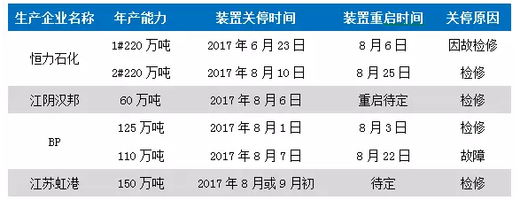 近期PTA工厂部分装置陆续重启,不过8月份仍有部分装置存在检修,按照目前了解的检修装置情况来算,预计8月份检修损失量达到19万吨附近。因此,现货供应依旧处于偏紧的装置。