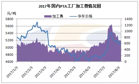 今年以来,PX-PTA加工费维持在500-600元/吨附近已成为常态,而7月份以来,由于PTA价格暴涨,PX价格偏低的情况下,加工费持续上升至1200元/吨附近水平,创近年来高点,而截止稿前,加工费回落至678元/吨上下,一定程度打击前期计划复产的装置,不过整体加工费水平高于往年同期水平,部分工厂存在盈利水平。
