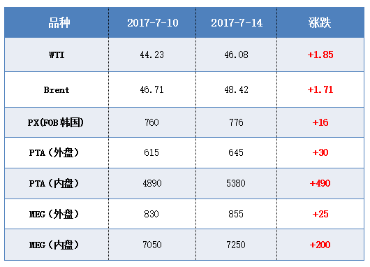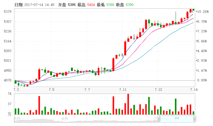 7月14日,郑商所PTA期货“高歌猛进”,完美实现“五连涨”,几近涨停,触及5400点!主力1709合约终盘再度大福收涨,以5390元/吨收盘,与上一交易日结算价相比,大幅上调了102元/吨,涨幅为1.93%;与10日当天日盘收盘价格相比,大幅上行了444元/吨,周内涨幅达到8.98%。