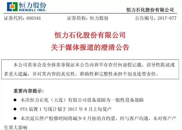 供应偏紧可谓是近来PTA强势上冲的根本动力,近日恒力石化(大连)有限公司因设备故障延长停产检修时间的消息在化纤行业内引起广泛关注。更有市场专业人士表示,这是PTA疯狂暴涨的导火索。恒力石化为此在13日发布公告,具体内容如下: